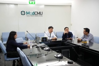 รศ.นพ.ณัฐพงศ์ โฆษชุณหนันท์ รองคณบดีคณะแพทยศาสตร์ มช. เป็นผู้แทนคณบดี ให้การต้อนรับ รศ.ดร.สุกรี เกษรเกศรา คณบดี และ ดร.วีระพันธ์ จันทร์หอม รองคณบดี คณะวิจิตรศิลป์ มช. พร้อมคณะ