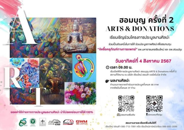 ขอเชิญท่านนักสะสมผลงานศิลปะ และผู้มีจิตเมตตา ร่วมเป็นส่วนหนึ่งในการให้ ในโครงการฮอมบุญ ART & DONATIONS ครั้งที่ 2 โครงการประมูลงานศิลปะ โดยการรวมตัวกันของศิลปินภาคเหนือ เพื่อสมทบทุน “จัดซื้อครุภัณฑ์ทางการแพทย์” โรงพยาบาลมหาราชนครเชียงใหม่ และ โรงพยาบาลสวนปรุง