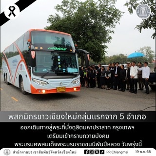 วันนี้ (19 พ.ย. 68) เวลา 16.00 น. ที่ บริเวณด้านหลังศาลากลางจังหวัดเชียงใหม่ นายรัฐพล นราดิศร ผู้ว่าราชการจังหวัดเชียงใหม่ พร้อมด้วย นายศิวะ ธมิกานนท์ รองผู้ว่าราชการจังหวัดเชียงใหม่ , นายชัยณรงค์ นันตาสาย ปลัดจังหวัดเชียงใหม่ , หัวหน้าส่วนราชการ และหน่วยงานที่เกี่ยวข้อง ร่วมปล่อยขบวนรถที่นำพสกนิกรชาวจังหวัดเชียงใหม่กลุ่มแรก จำนวน 750 คน จาก 5 อำเภอ ประกอบด้วย อำเภอกัลยาณิวัฒนา ฮอด แม่แจ่ม สันป่าตอง และอำเภอแม่ริม เดินทางไปเข้า กราบถวายบังคมพระบรมศพสมเด็จพระนางเจ้าสิริกิติ์ พระบรมราชินีนาถ พระบรมราชชนนีพันปีหลวง ณ พระที่นั่งดุสิตมหาปราสาท ในพระบรมมหาราชวัง กรุงเทพมหานคร ในช่วงเช้าวันพรุ่งนี้ (20 พ.ย. 68)