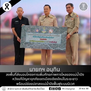 วันนี้ (20 พ.ย. 68) ที่ บริเวณพื้นที่สาธารณประโยชน์ริมแม่น้ำปิง เชิงสะพานเม็งราย ต.วัดเกตุ อ.เมืองเชียงใหม่ จ.เชียงใหม่ นายอนุทิน ชาญวีรกูล นายกรัฐมนตรีและรัฐมนตรีว่าการกระทรวงมหาดไทย เป็นประธานและเป็นสักขีพยานในพิธีส่งมอบโครงการเพิ่มประสิทธิภาพการรองรับและการไหลของแม่น้ำปิง หรือ “โครงการขุดลอกแม่น้ำปิง” เพื่อป้องกันอุทกภัยเขตเมืองเชียงใหม่ระยะเร่งด่วน ระหว่าง พลเอก อุกฤษฎ์ บุญตานนท์ ผู้บัญชาการทหารสูงสุด ส่งมอบโครงการให้กับ นายรัฐพล นราดิศร ผู้ว่าราชการจังหวัดเชียงใหม่ โดยมีผู้บริหารกระทรวง หัวหน้าส่วนราชการ หน่วยงานที่เกี่ยวข้อง และประชาชนชาวเชียงใหม่ ร่วมพิธี