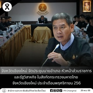 วันนี้ (26 พ.ย. 68) เวลา 14.00 น. ที่ห้องประชุม 3 ชั้น 3 อาคารอำนวยการ ศาลากลางจังหวัดเชียงใหม่ นายรัฐพล นราดิศร ผู้ว่าราชการจังหวัดเชียงใหม่ เป็นประธานการประชุมนายอำเภอ หัวหน้าส่วนราชการ และรัฐวิสาหกิจ ในสังกัดกระทรวงมหาดไทย จังหวัดเชียงใหม่ ประจำเดือนพฤศจิกายน 2568 โดยมี นายชัชวาลย์ ปัญญา รองผู้ว่าราชการจังหวัดเชียงใหม่ นายศิวะ ธมิกานนท์ รองผู้ว่าราชการจังหวัดเชียงใหม่ นายชัยณรงค์ นันตาสาย ปลัดจังหวัดเชียงใหม่ หัวหน้าส่วนราชการ และหน่วยงานที่เกี่ยวข้อง เข้าร่วมประชุม