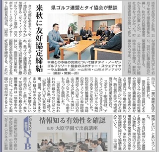 เมื่อวันที่ 19 ธันวาคม 2568 นายสุพชฌาย์ เสวตไอยาราม รองประธานสมาคมกอล์ฟรีสอร์ทภาคเหนือของไทย ซึ่งเป็นตัวแทนของสนามกอล์ฟ 8 แห่งในจังหวัดเชียงใหม่ ได้เดินทางไปเยี่ยมชมอาคารยามากาตะมีเดียทาวเวอร์ ในเมืองยามากาตะ และได้พบกับซาโตะ ฮิเดยูกิ ประธานหนังสือพิมพ์ยามากาตะชิมบุน และประธานสหพันธ์กอล์ฟจังหวัด ทั้งสองสมาคมจะลงนามในข้อตกลงมิตรภาพในฤดูใบไม้ร่วงปีหน้า เพื่อส่งเสริมการแลกเปลี่ยนระหว่างประเทศ ทั้งสองสมาคมยืนยันความตั้งใจที่จะกระชับความสัมพันธ์ให้แน่นแฟ้นยิ่งขึ้นเพื่อเตรียมการสำหรับข้อตกลงนี้
