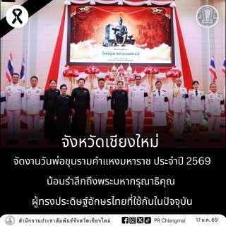 วันนี้ (17 ม.ค. 69) ที่ ห้องประชุมสภา องค์การบริหารส่วนจังหวัดเชียงใหม่ นายรัฐพล นราดิศร ผู้ว่าราชการจังหวัดเชียงใหม่ นำคณะผู้บริหารจังหวัดฯ ส่วนราชการ และประชาชนชาวเชียงใหม่ ร่วมพิธีวางพานพุ่มถวายราชสักการะ พร้อมกล่าวคำถวายราชสดุดี เบื้องหน้าพระบรมสาทิสลักษณ์ของพ่อขุนรามคำแหงมหาราช เนื่องในวันพ่อขุนรามคำแหงมหาราช ประจำปี 2569 เพื่อน้อมรำลึกถึงพระมหากรุณาธิคุณของพระองค์ที่ทรงมีต่อพสกนิกรชาวไทย