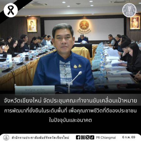 วันนี้ (6 ก.พ. 69) เวลา 13.40 น. ที่ ห้องประชุม 3 ชั้น 3 อาคารอำนวยการ ศาลากลางจังหวัดเชียงใหม่ นายรัฐพล นราดิศร ผู้ว่าราชการจังหวัดเชียงใหม่ เป็นประธานการประชุมคณะทำงานขับเคลื่อนเป้าหมายการพัฒนาที่ยั่งยืนในระดับพื้นที่ จังหวัดเชียงใหม่ ครั้งที่ 1/2569 เพื่อขับเคลื่อนเป้าหมายการพัฒนาที่ยั่งยืนของจังหวัดเชียงใหม่ 16 เป้าหมายหลัก (ยกเว้นเป้าหมายที่ 14 ด้านการอนุรักษ์และใช้ประโยชน์จากมหาสมุทร ทะเล และทรัพยากรทางทะเล) โดยมี นายบุญลือ ธรรมธรานุรักษ์ รองผู้ว่าราชการจังหวัดเชียงใหม่ หัวหน้าส่วนราชการ และหน่วยงานที่เกี่ยวข้อง เข้าร่วมประชุม