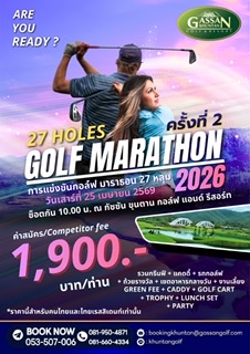 คุณฟ้กัซซัน เรียนเชิญร่วมแข่งกอล์มาราธอน27หลุมสองแมทช์เลือกซื้อสองแมทช์หรือแมท้ดียวก็ได้ แข่ง27หลุมมีอาหารของขวัญถวยรางวัลมากมาย