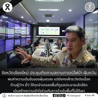 วันนี้ในที่ประชุม สำนักงานสิ่งแวดล้อมและควบคุมมลพิษที่ 1 ได้รายงานว่าแนวโน้มค่าความเข้มข้นของฝุ่น PM 2.5 ลดลงอย่างต่อเนื่อง ขณะที่ศูนย์อุตุนิยมวิทยาภาคเหนือ รายงานเพิ่มเติมว่า อัตราการระบายอากาศภาพรวมในห้วงวันที่ 8-11 เมษายน นี้ มีอัตราการระบายอากาศดีขึ้น แต่หลังจากวันที่ 12 เมษายนเป็นต้นไป อัตราการระบายอากาศเริ่มอยู่ในเกณฑ์ไม่ดีอีกครั้ง โดยเฉพาะระหว่างวันที่ 13-15 เมษายนที่จะถึงนี้ จึงขอให้ประชาชนดูแลสุขภาพ และเฝ้าระวังในประชาชนกลุ่มเสี่ยงโรคที่เกี่ยวข้องด้วย